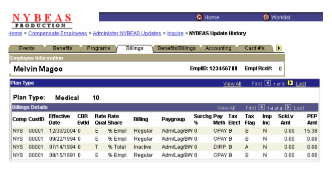 To view the PEP credit calculated, click on Inquire, NYBEAS Update History and the Billings tab